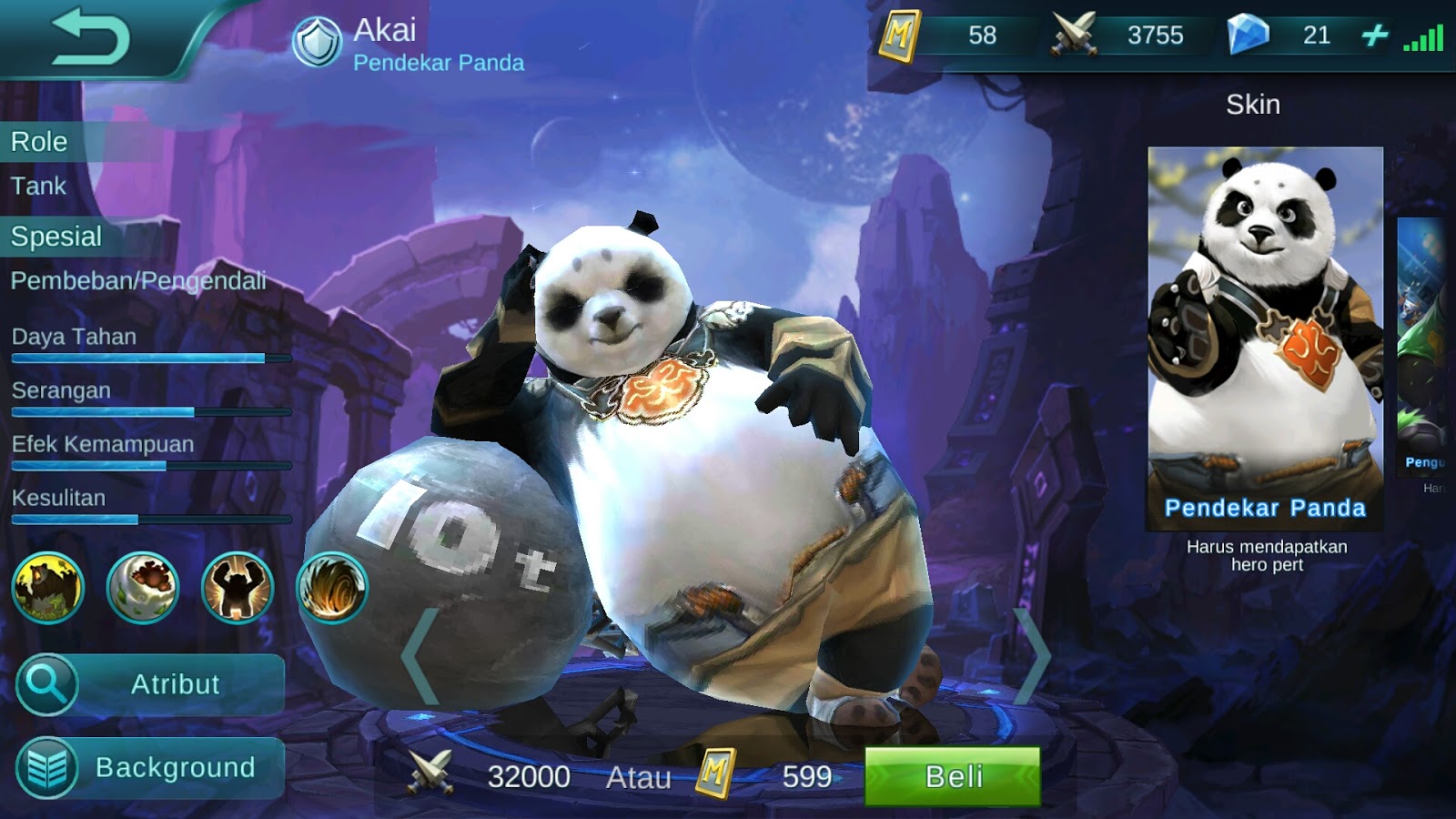 Everyone has a dream, so does a clumsy panda! In an eastern village far away, there lives a group of pandas most of which enjoy a simple and happy life. However, a round panda called Akai made an unusual resolution to become a battle master! His parents tried to talk down his strange daydream, and his friend taunted him about his clumsy and round physique. Yet he never compromised and still trained himself hardly every day, eager to be stronger. One day, his persistence moved a mystic monk who just wandered to here. Under the monk's guide, Akai learned to use a chain hammer as his weapon which was extremely hard to control. He has been dreaming about starting an epic competition with other battle masters on the same stage in the Land of Dawn, and now here he goes with his most briliant appearance.Hero tipe Tanker Akai Moba Legends